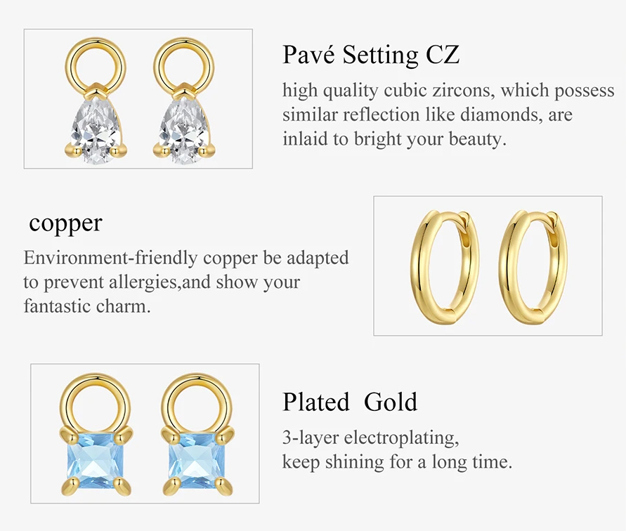 BAMOER σκουλαρίκια κρίκοι YIE262 με 3x σετ charm, κυβική ζιρκόνια, χαλκός, χρυσό