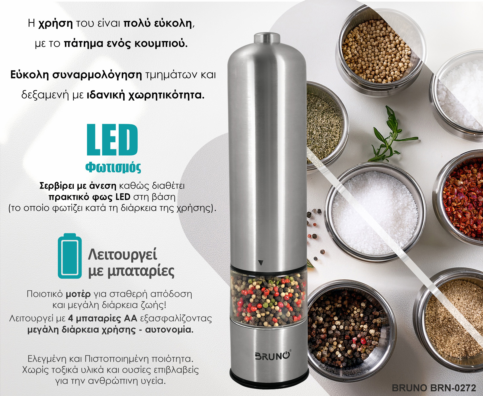 -Βασικές Λειτουργίες: Αλέθει χοντρό αλάτι, πιπέρι σε κόκκους, φρέσκα μπαχαρικά, βότανα και σπόρους.