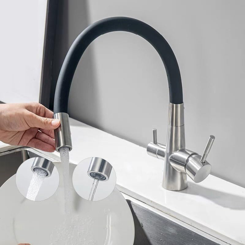 Αυτή η μπαταρία πάγκου κουζίνας διαθέτει τρίοδο σχεδιασμό για τη σύνδεση με φίλτρο νερού και το δίκτυο παροχής ζεστού και κρύου νερού. Έτσι, μπορείτε να απολαμβάνετε καθαρό, φιλτραρισμένο νερό και να επιλέξετε παράλληλα ανάμεσα σε ζεστό και κρύο νερό με τους διακόπτες.