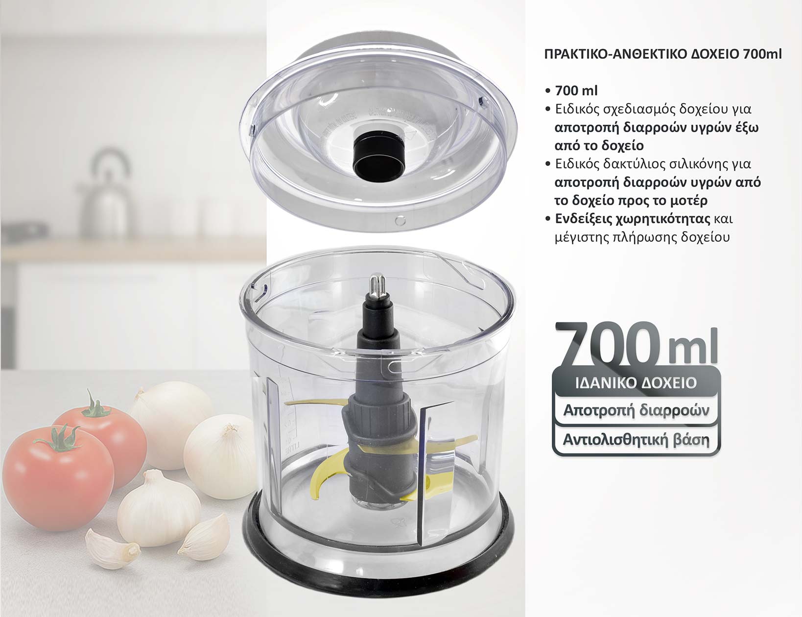 Πρακτικό δοχείο 700ml με ένδειξη μέγιστης πλήρωσης. Ειδικός σχεδιασμός για αποτροπή διαρροών και αντιολισθητική-αντικραδασμική βάση.