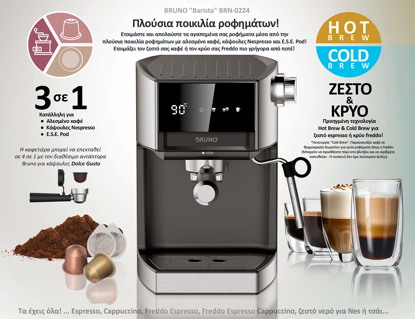 Η Μηχανή Espresso & Cappuccino, 3 σε 1, Hot & Cold, BRUNO “Barista” BRN-0224 συνδυάζει την απόλυτη ευελιξία στην ετοιμασία του αγαπημένους σας ροφήματος, το άψογο αποτέλεσμα στην γεύση του καφέ και την ευκολία στην χρήση!