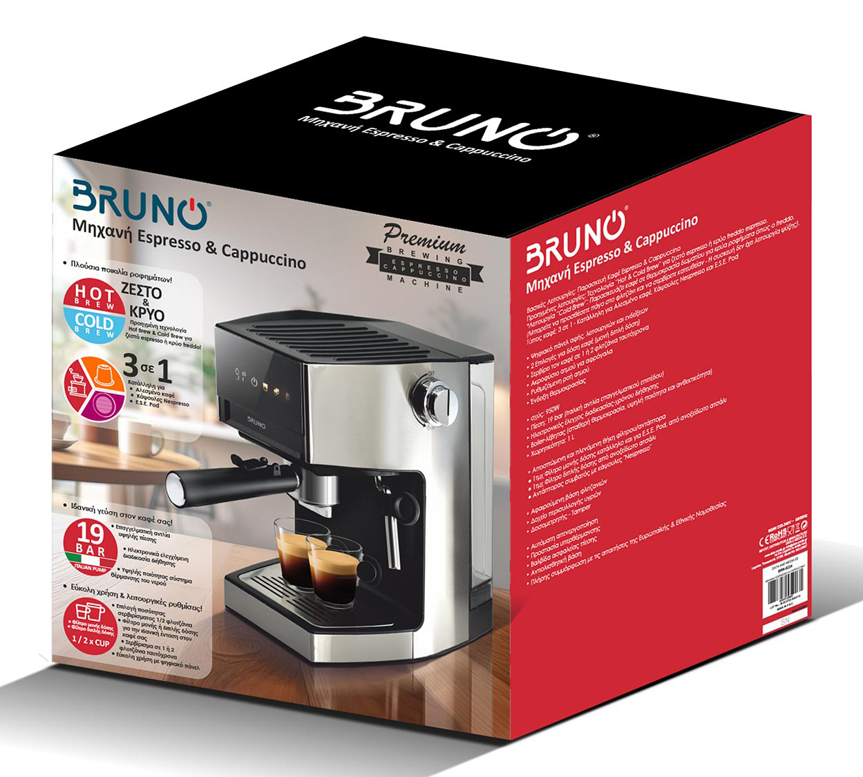 BRUNO “Barista” BRN-0224 Αυτόματη Μηχανή Espresso & Cappuccino, 3 σε 1, Hot & Cold, 950W, 19 bar, ψηφιακή