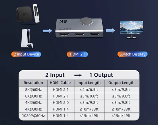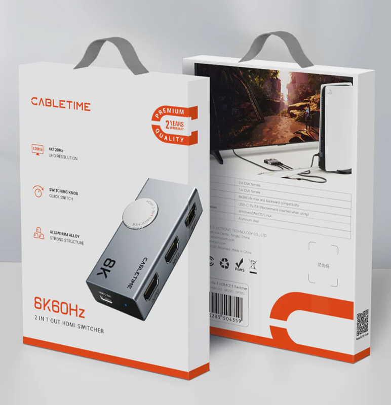 CABLETIME HDMI switch CT-HS8K2-AG, 2 σε 1, 8K/60Hz, 4K/120Hz, γκρι