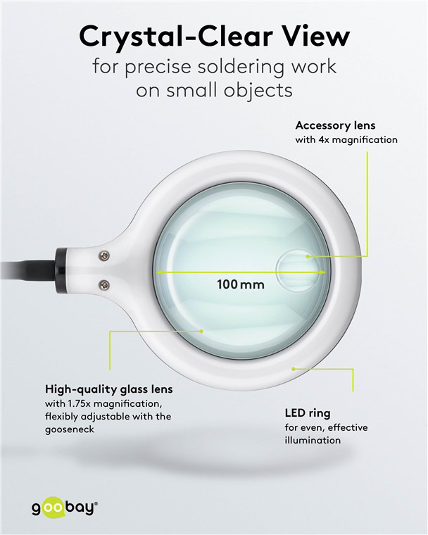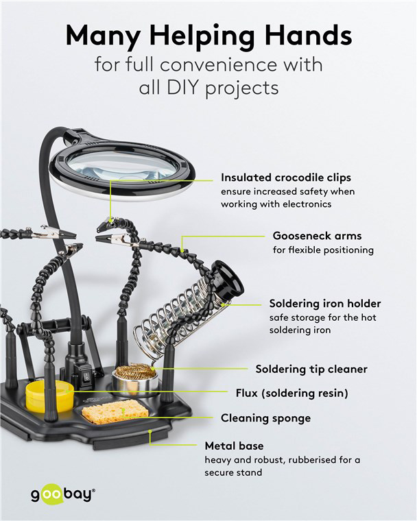 GOOBAY βάση στήριξης πλακέτας 76558 με μεγεθυντικό φακό & θέση για κολλητήρι, 4x βραχίονες, μαύρη
