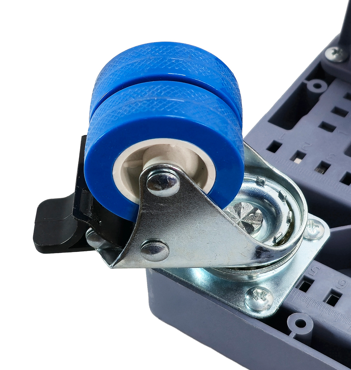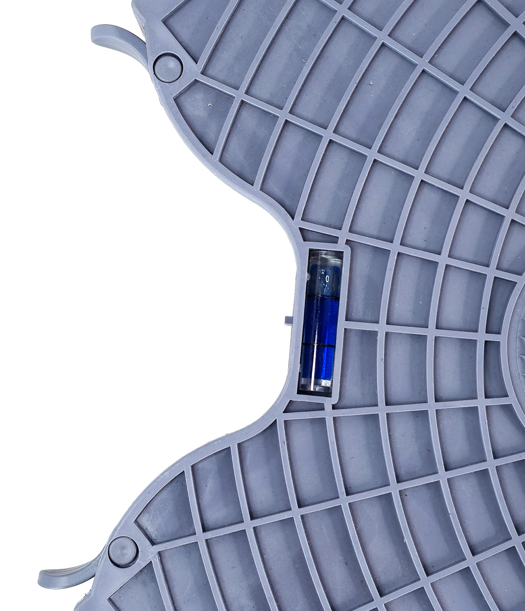 Διαθέτει 4 διπλούς τροχούς με φρένα ακινητοποίησης, 8 ποδαράκια ρυθμιζόμενου ύψους και αλφάδι για την διευκόλυνση της τοποθέτησης των αντικειμένων.