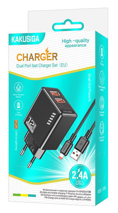 KAKUSIGA φορτιστής τοίχου KSC-1238 με καλώδιο Lightning, 2x USB, 12W, μαύρος