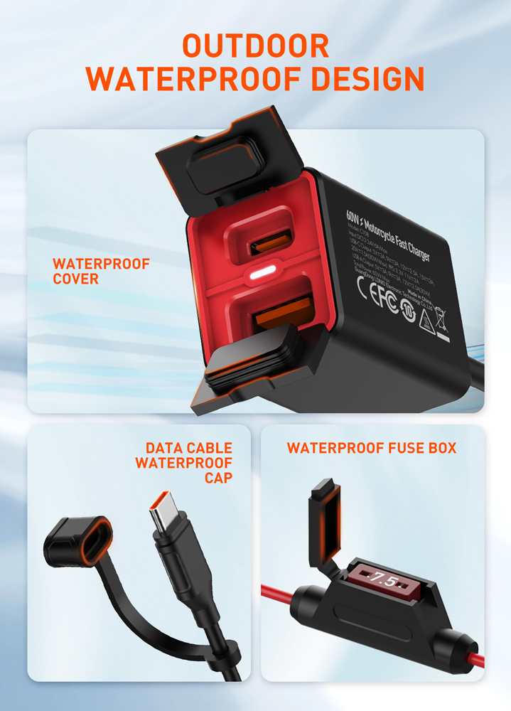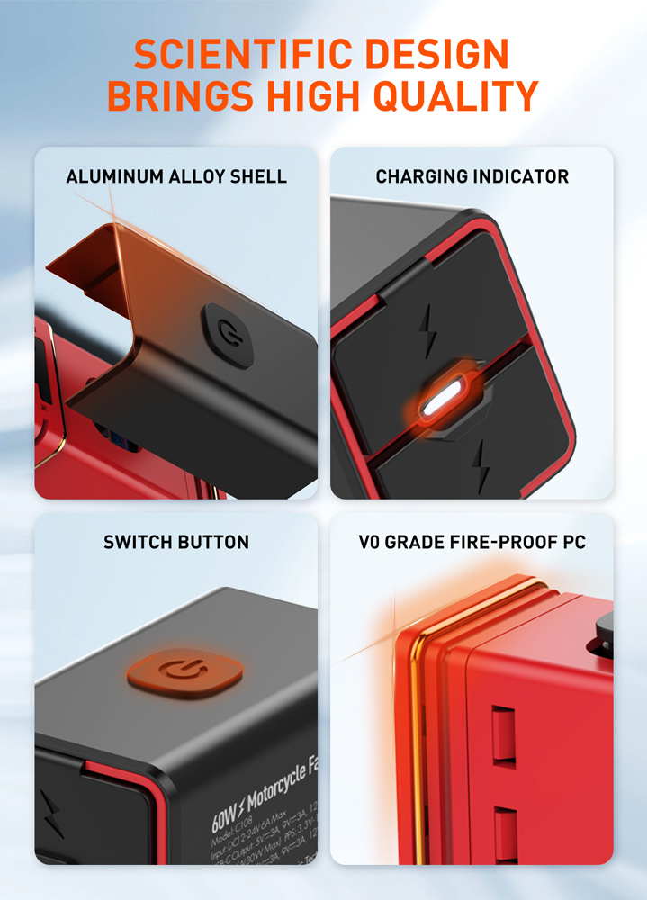 Υψηλής απόδοσης φορτιστής μοτοσυκλέτας, συμβατός με συσκευές που φορτίζουν μέσω θύρας USB.