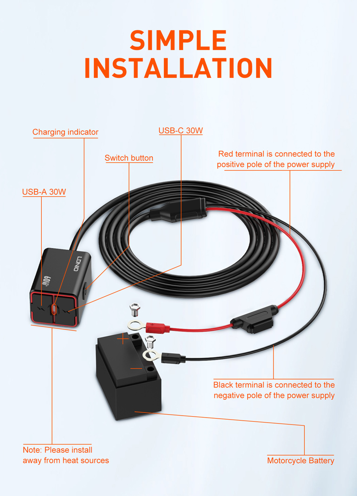 Η τοποθέτηση του φορτιστή γίνεται στο τιμόνι ενώ για την λειτουργία του απαιτείται τροφοδοσία από την μπαταρία της μοτοσυκλέτας.