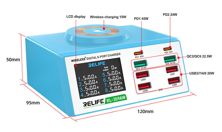 Υψηλής απόδοσης σταθμός φόρτισης της Relife, κατασκευασμένος από ανθεκτικό υλικό και συμβατός με συσκευές που φορτίζουν ασύρματα ή μέσω USB θύρας.