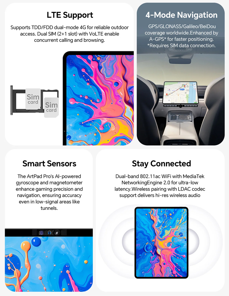Με υποστήριξη διπλής κάρτα SIM και δικτύου 4G, το tablet ArtPad Pro σας επιτρέπει να παραμείνετε συνδεδεμένοι όπου κι αν βρίσκεστε. Επιπλέον, η τεχνολογία WiFi σας εξασφαλίζει γρήγορη και αξιόπιστη ασύρματη σύνδεση.