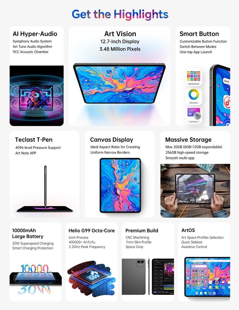 TECLAST tablet ArtPad Pro με στυλό αφής, 12.7″, 8/256GB, 4G, Android 15, 10000mAh, γκρι