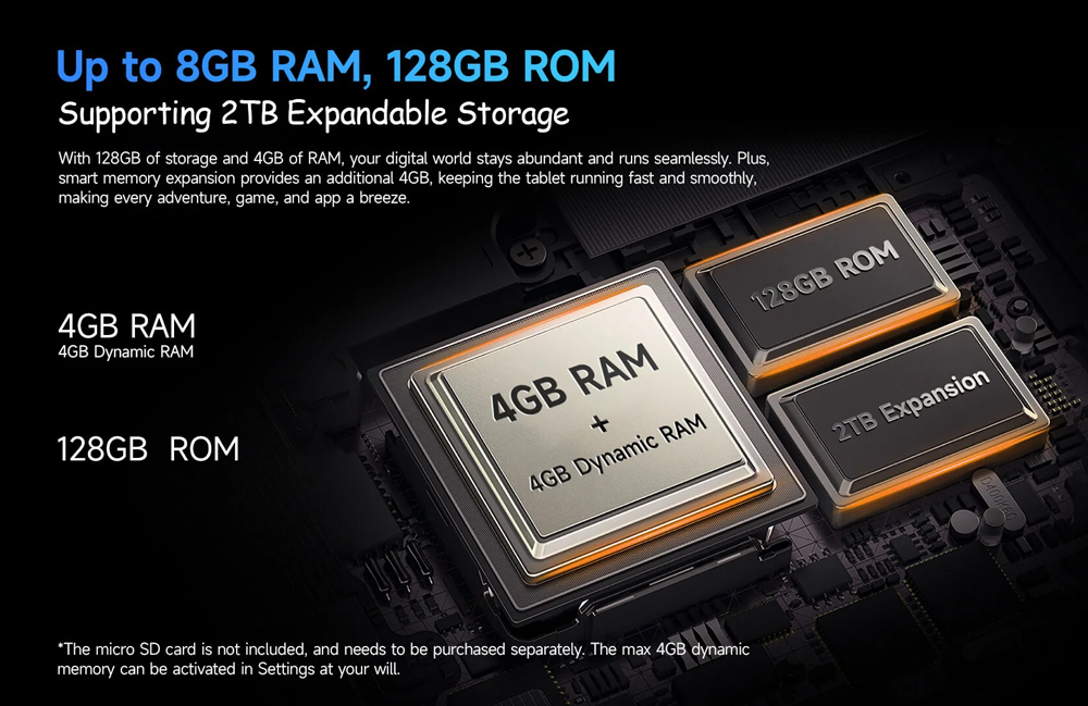 Με 4GB (+4GB virtual) RAM και 128GB ROM για να αποθηκεύετε τα αγαπημένα σας αρχεία, φωτογραφίες και βίντεο. Επιπλέον, προσφέρει την δυνατότητα να επεκτείνετε τον χώρο αποθήκευσης του tablet με κάρτα micro SD έως 2TB.