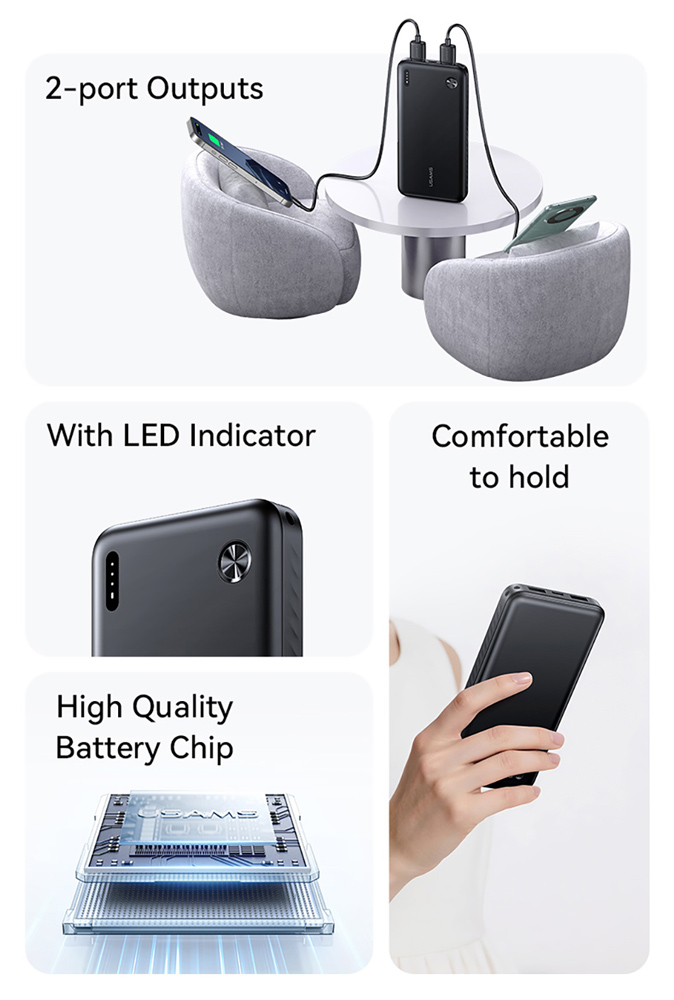 Με το power bank της Usams η χαμηλή στάθμη της μπαταρίας δεν θα αποτελεί άλλο πρόβλημα, καθώς σας επιτρέπει να φορτίσετε smartphone, tablet, ακουστικά και άλλες φορητές συσκευές οπού και αν βρίσκεστε.