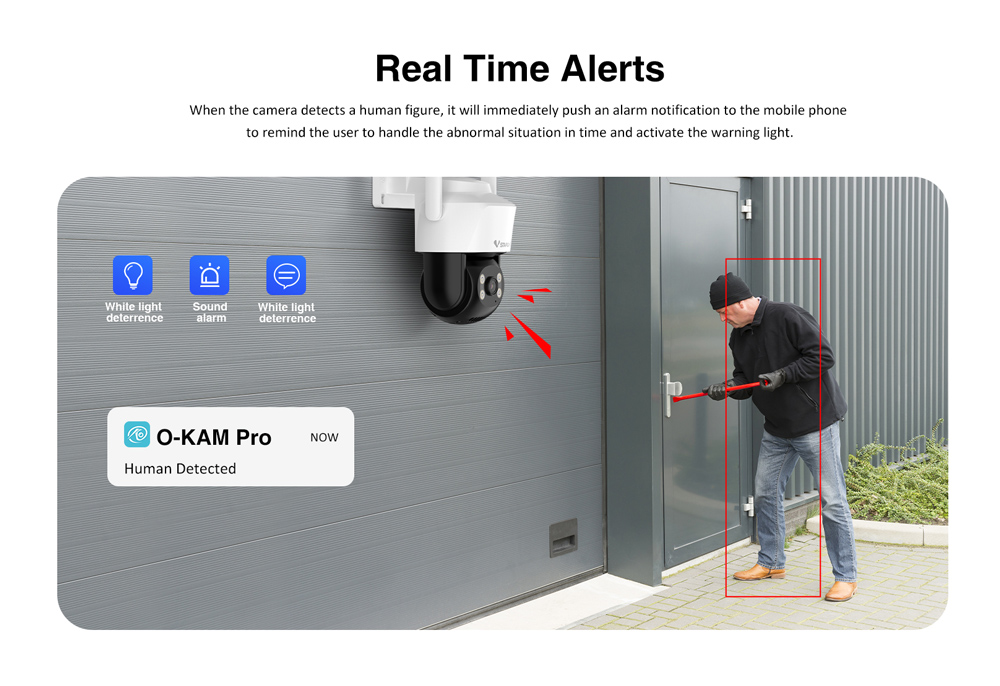 -Alarm detection: Motion detection, human detection, human framing, siren alarm, and area detection