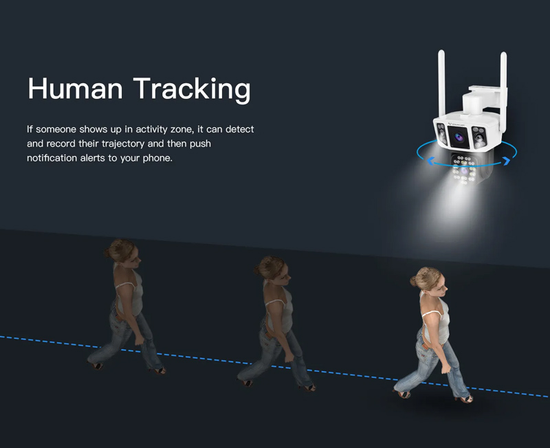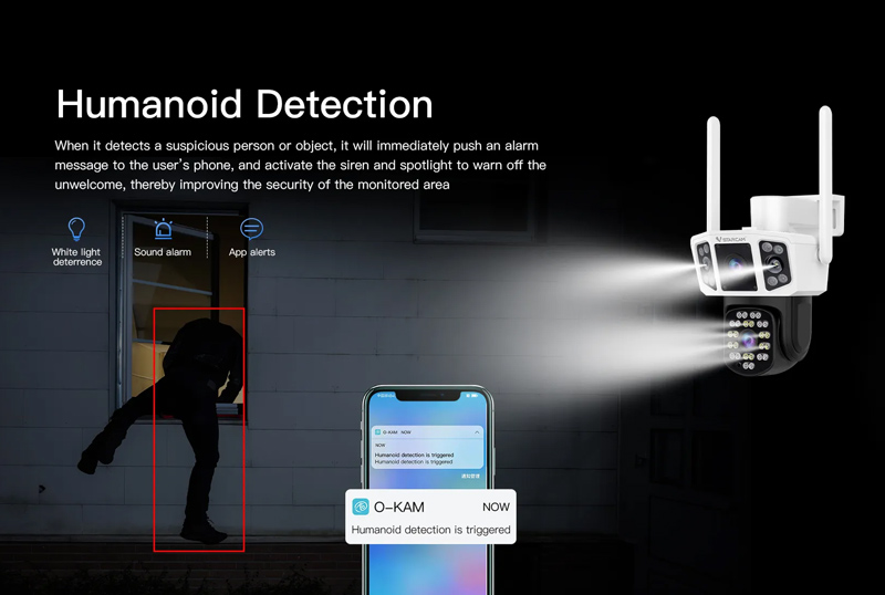 Μπορεί να ανιχνεύσει την ανθρώπινη σιλουέτα και κίνηση, στέλνοντας ειδοποιήσεις στο smartphone σας κάθε φορά που ανιχνεύεται κίνηση αλλά και να ενεργοποιήσει ηχητικό και οπτικό (με φως) συναγερμό.
